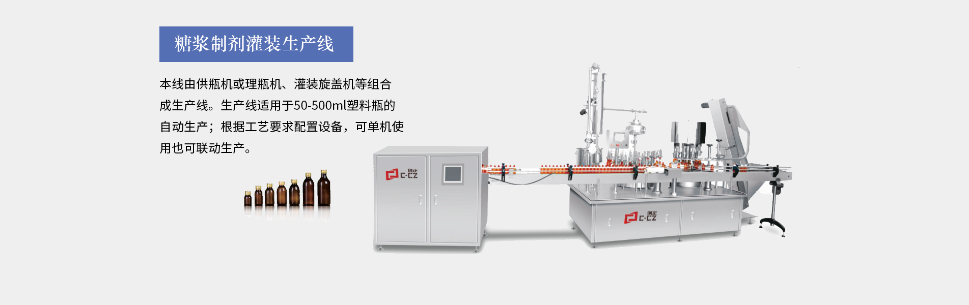 糖漿灌裝生產(chǎn)線適合30ML以上口服液的灌裝生產(chǎn),由供瓶機、直線式灌裝軋(旋)蓋機、立式貼標(biāo)機等設(shè)備組成,可全自動完成灌裝、上蓋、旋(軋)蓋、貼標(biāo)等工序。主要用于制藥、食品、化工的的各種液體物料的灌裝聯(lián)動生產(chǎn)。本生產(chǎn)線完全符合GMP要求。糖漿灌裝生產(chǎn)線特點裝量特征:無滴漏、不起泡、不飛濺。運行特征:運行穩(wěn)定,噪音小;灌裝精確,能耗少,破瓶率低,成品合格率高性能特征:整條生產(chǎn)線可單機控制和聯(lián)鎖控制。洗瓶...